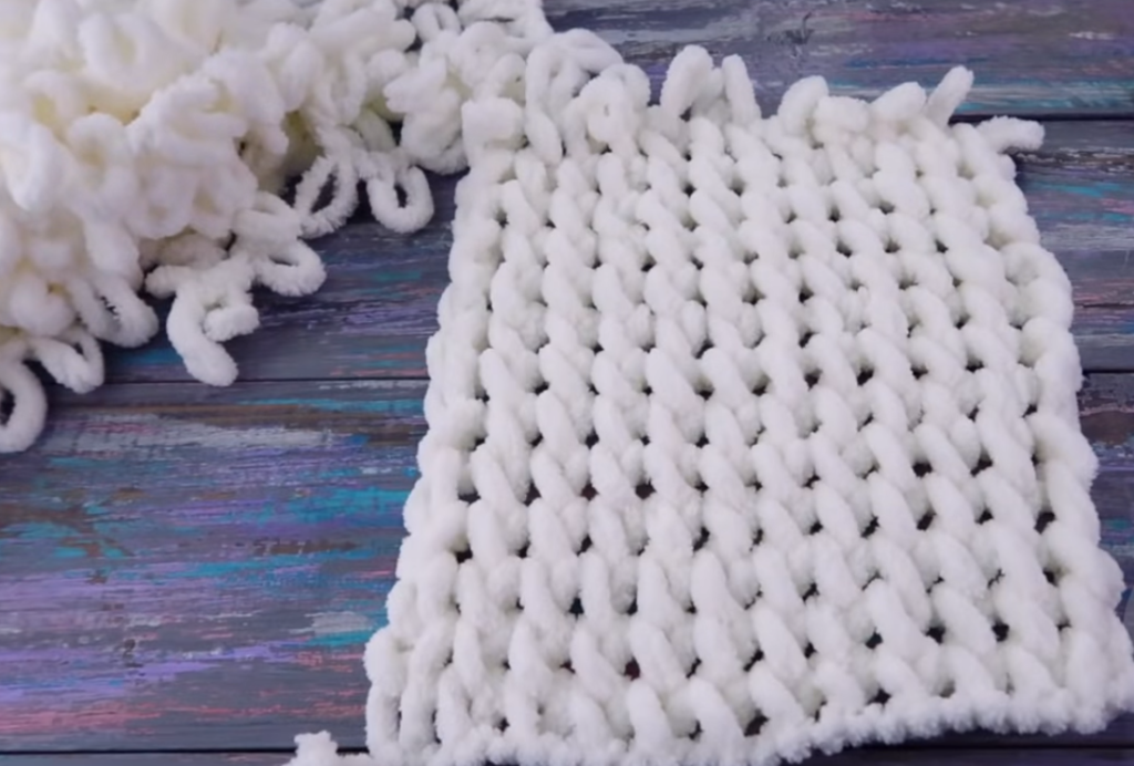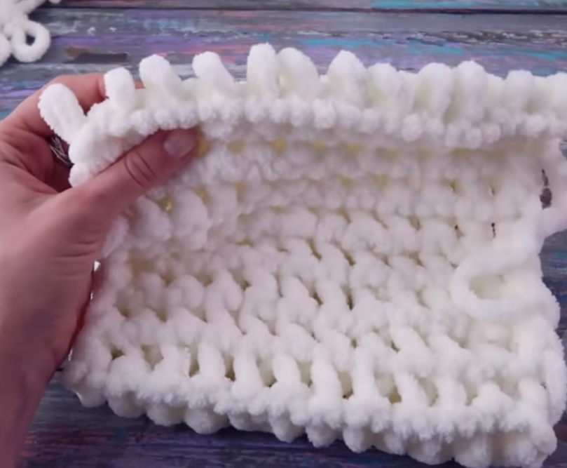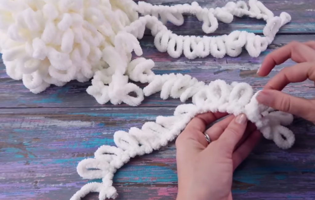Эта пряжа — не стандартная, она изначально состоит из одинаковых петель словно нанизанных на единое основание из нити.
