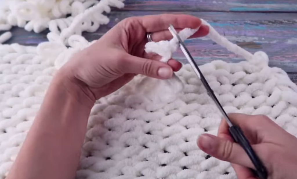 Рабочую нить обрезаем и сшиваем с краем. Плед готов.