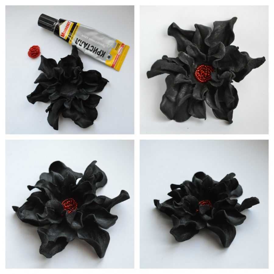 Для создания цветка понадобятся обрезки тонкой кожи, которые нужно вырезать по форме лепестков. Лепестки могут быть складчатыми (для этого кожу вымачивают в смеси клея ПВА и воды, а потом формируют складки и дают им высохнуть) или быть просто выгнутыми, как настоящие (для этого нужно нагреть лепесток над огнем и провести по нему ножом с нажимом, формируя изгиб, после остывания лепесток будет держать форму). Далее лепестки приклеивают на картонную основу и приклеивают к старой заколке или крепят на сумке или одежде.