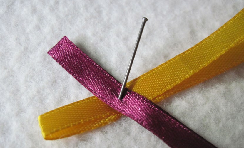 Для работы Вам нужны будут 2 ленты. Их длина должна быть 2-2,5 метра. Можно взять 4 ленты длиной по 1,20 м. В 1-м случае, положите ленты крест-накрест и закрепите их булавкой. Во 2-м случае, все ленты завяжите в узел. Узел закрепите булавкой.