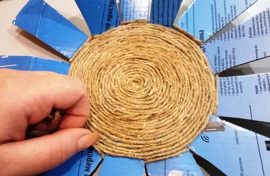 - с помощью джутовой нити, картона и клеевого пистолета;
