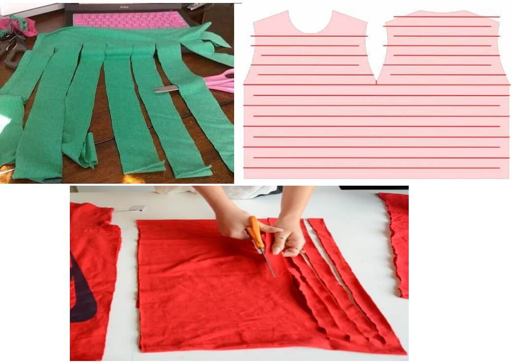 Отрезают верх футболки с рукавами, оставляют только ту часть, которая одевается на тело. Получается такая своеобразная труба, в которой чаще всего даже нет швов. Складывают ее пополам и режут на ленточки. Возле одного сгиба или шва оставляют неразрезанную полоску в 4-5 см. Ее разрезают по косой после того, как порежут все ленточки. Получается длинная полоска. Можно из футболки сделать большое полотно – срезать плечи и разрезать по одной из сторон. Вырезают полоски – по спирали или по кругу, по прямой.