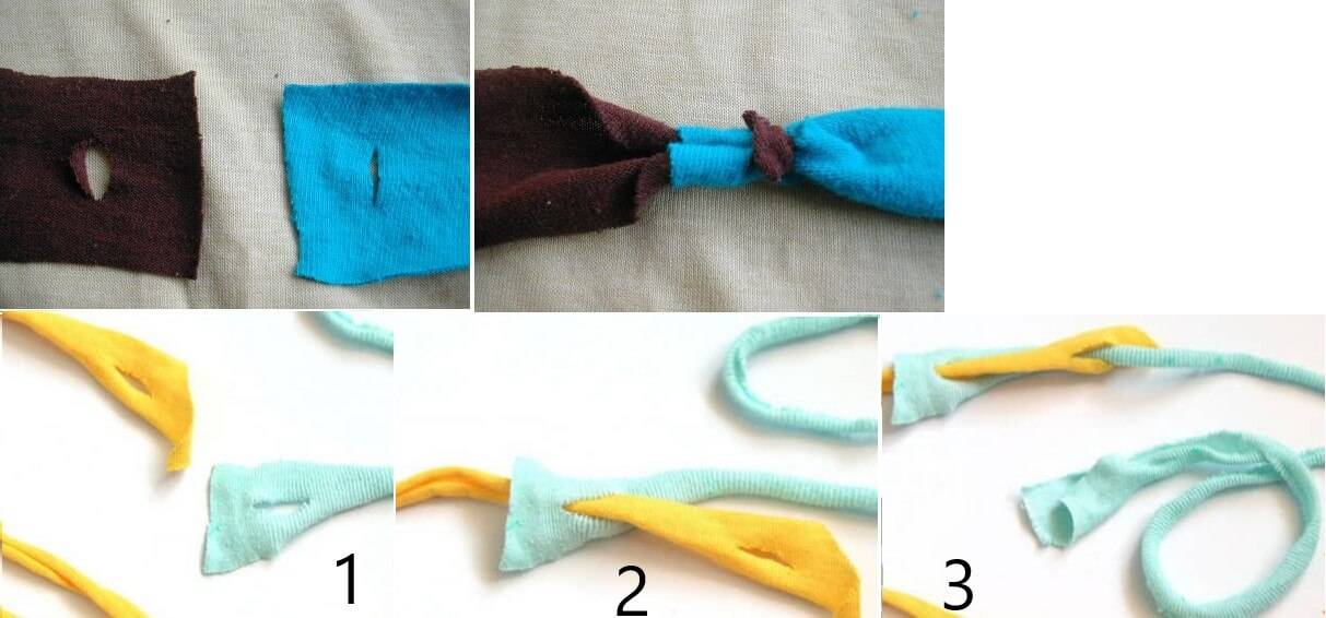 Ленты можно не сшивать, а связывать узелками. Их во время работы переводят на изнаночную сторону. Существует несколько вариантов соединения полосок без шитья. Описание: