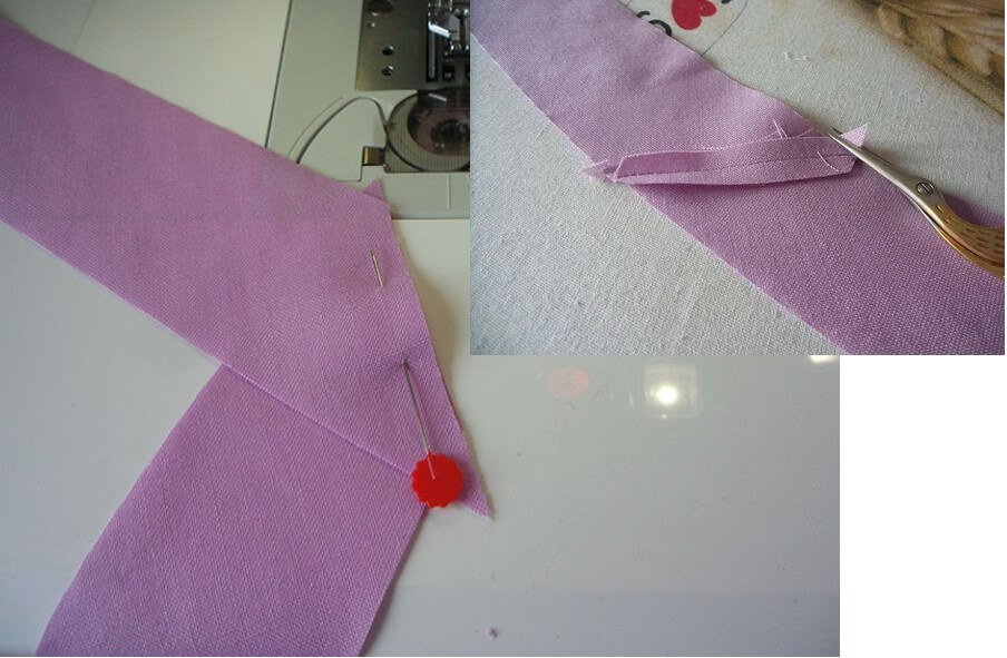 - если лента того или иного цвета подходит к концу, нужно соединить ее следующим образом: пришейте к ней такую же под углом в 90 градусов. Диагонально сделайте строчку по ходу удлинения ленты. Принцип строчки вам будет понятен при срезании углов полукругом на маленьких концах, после того, как вы сшили ленты — она должна идти по параллельному срезу пути, а срез должен осуществляться с минимальным отступом от уровня строчки;