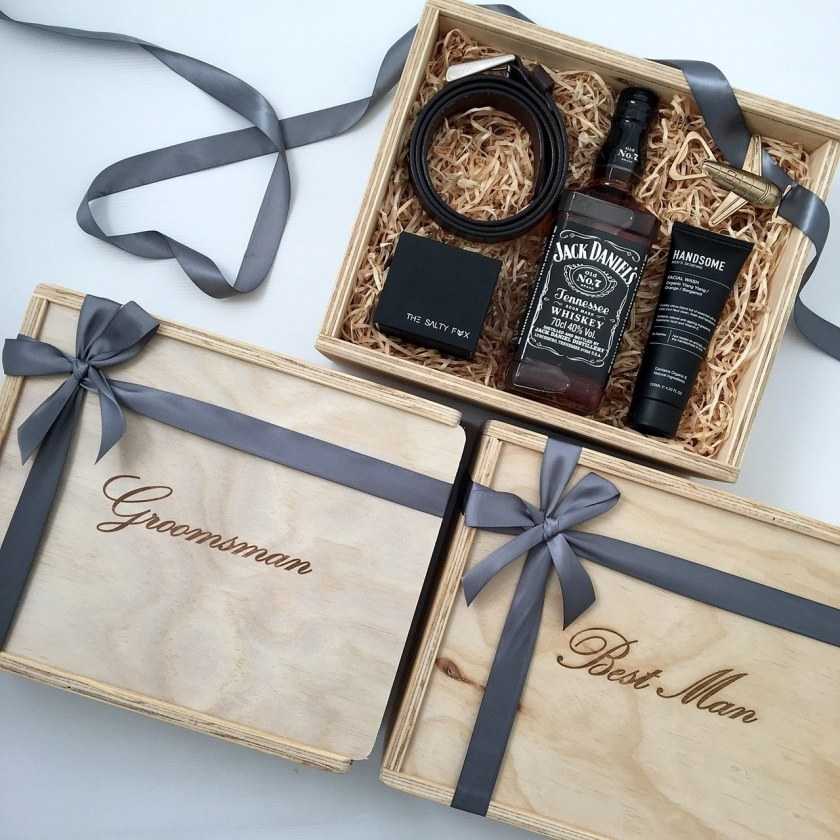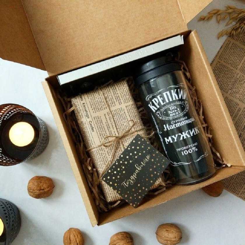 - Набор настоящего мужчины. По сути — декорированная коробка, наполненная полезными или бесполезными вещами. Как правило, подарок носит тематический характер. Например, молодому человеку, не имеющему семью, кладут молоток, шоколад и детскую пустышку. Мужчине постарше — бутылку виски, носки и пену для бритья.