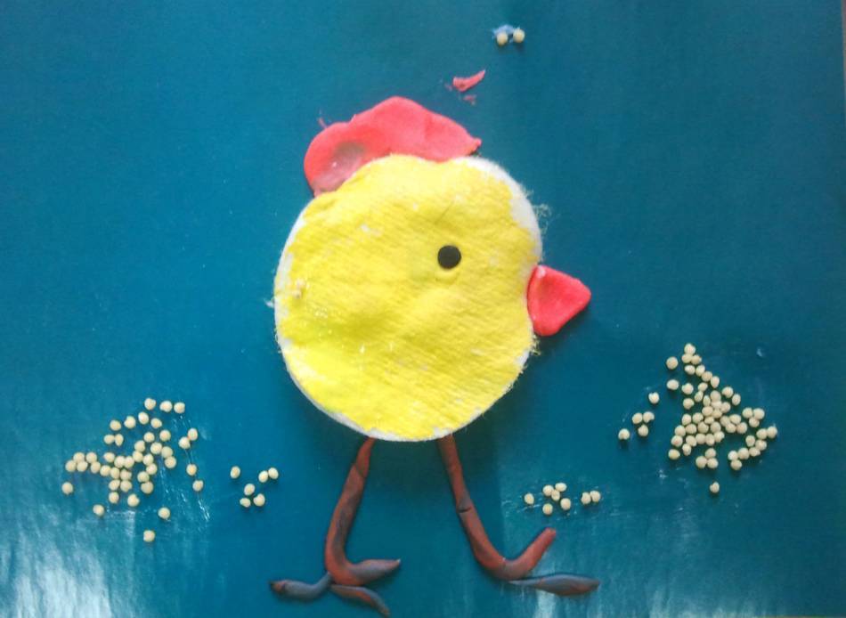 - Вырежьте из красной бумаги гребешок и клюв. Приклейте глазки. Можете отдельно из ватного диска вырезать крылышки и приклеить их к телу цыпленка.