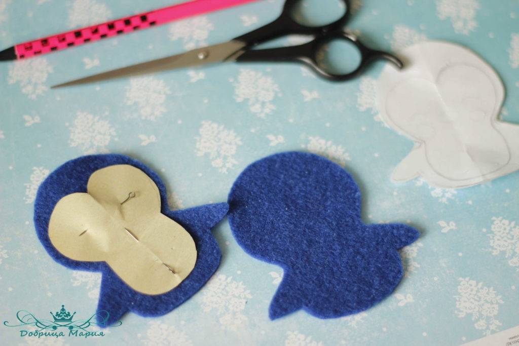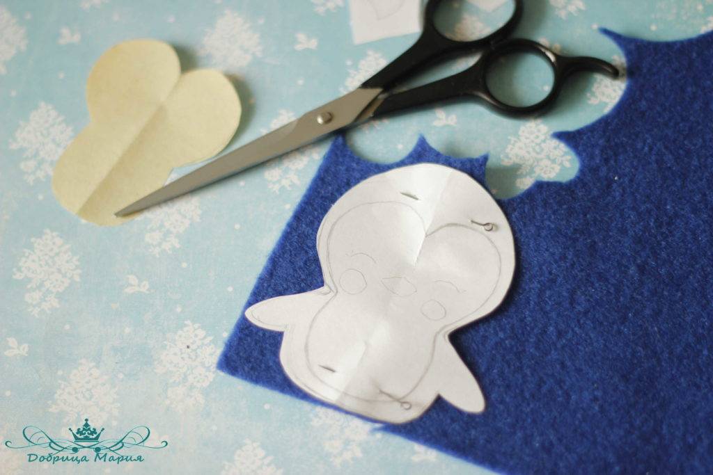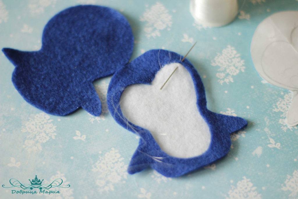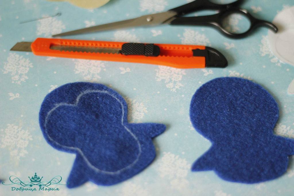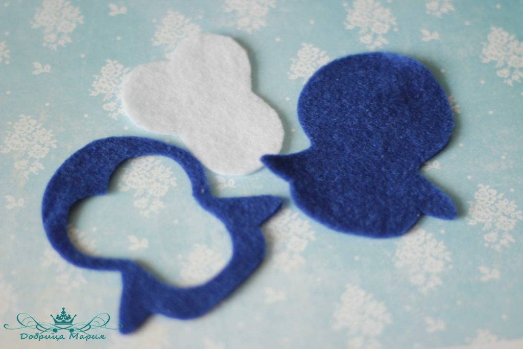 Затем нужно нарисовать и вырезать каждую деталь отдельно на бумаге. Например, весь пингвин, затем грудь, щеки, нос, лапы. Как правило, все, что нужно сшить, должно быть сшито отдельно. Затем приложите выкройку к фетру, закрепите ее булавками и аккуратно вырежьте.