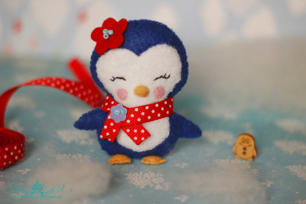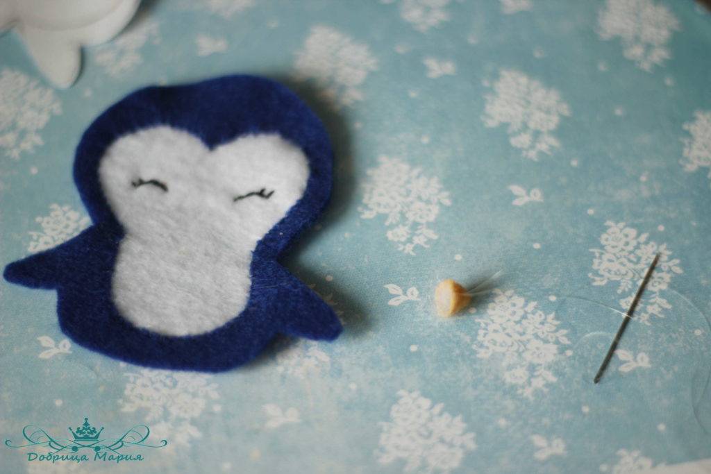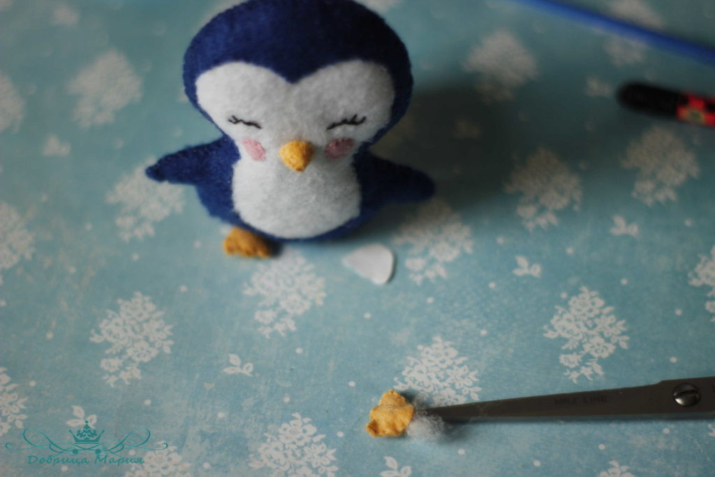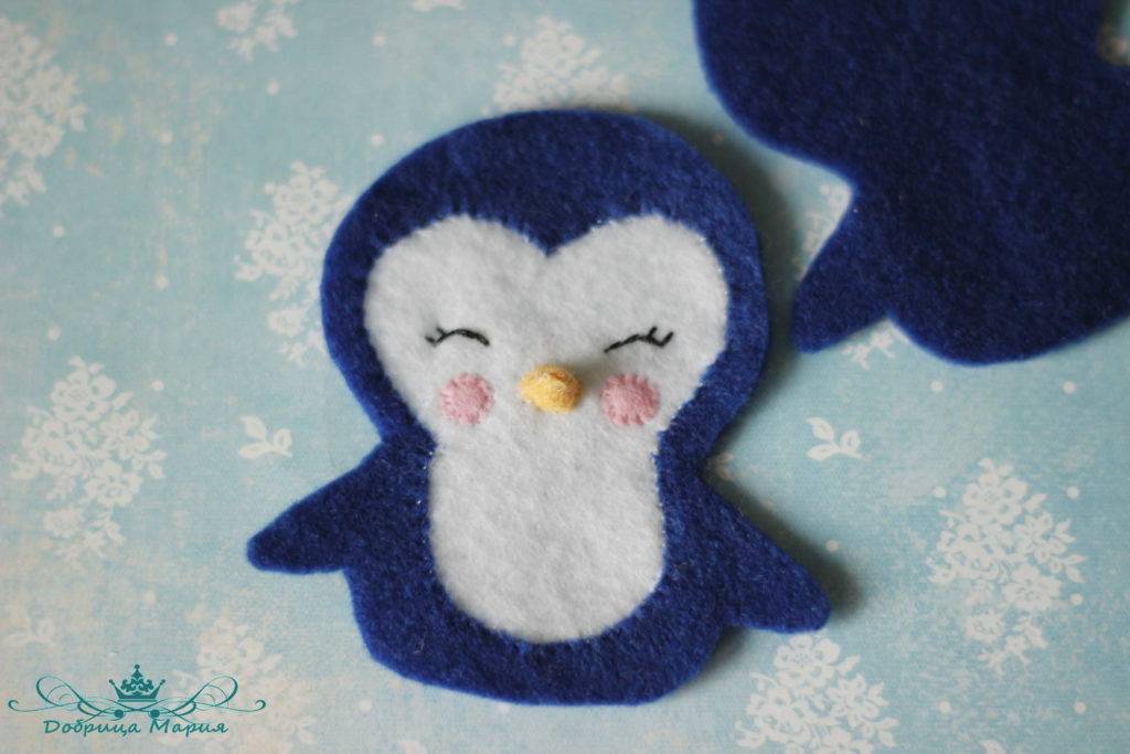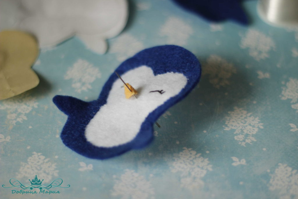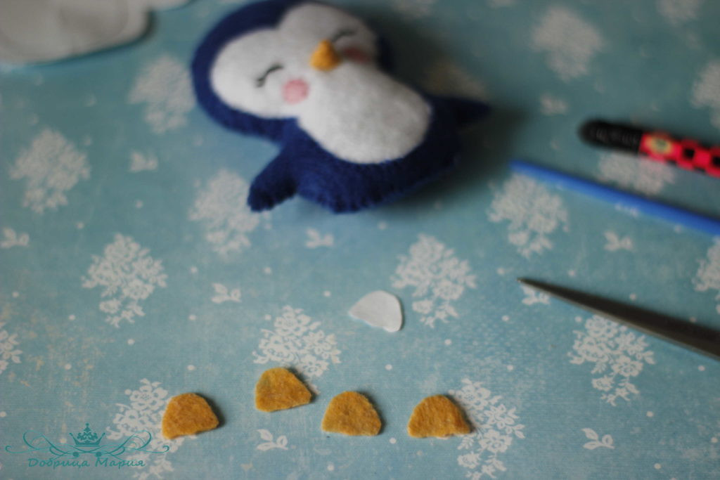Затем нужно нарисовать и вырезать каждую деталь отдельно на бумаге. Например, весь пингвин, затем грудь, щеки, нос, лапы. Как правило, все, что нужно сшить, должно быть сшито отдельно. Затем приложите выкройку к фетру, закрепите ее булавками и аккуратно вырежьте.