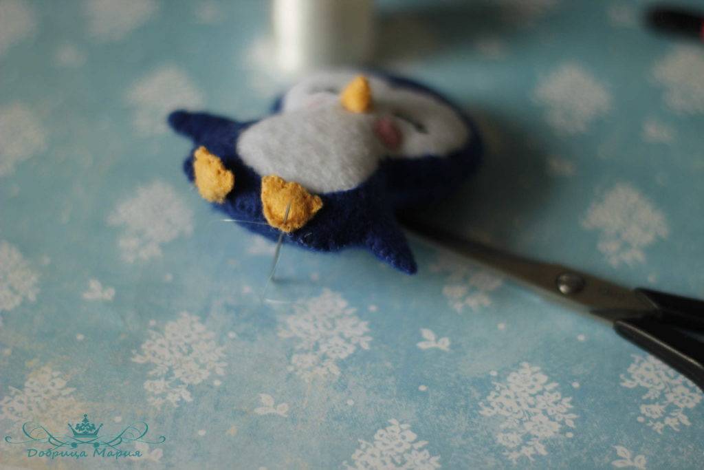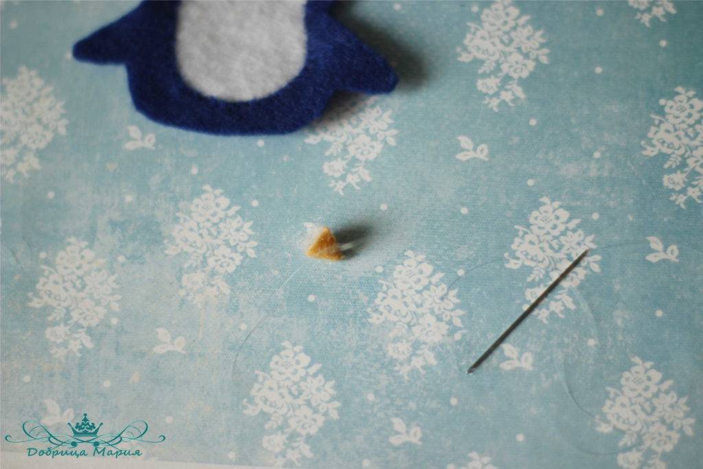 Наметьте место для глаз и вышейте их черной нитью. Что касается клюва, то два небольших треугольника сшиваются с двух сторон и набиваются синтетическим материалом.