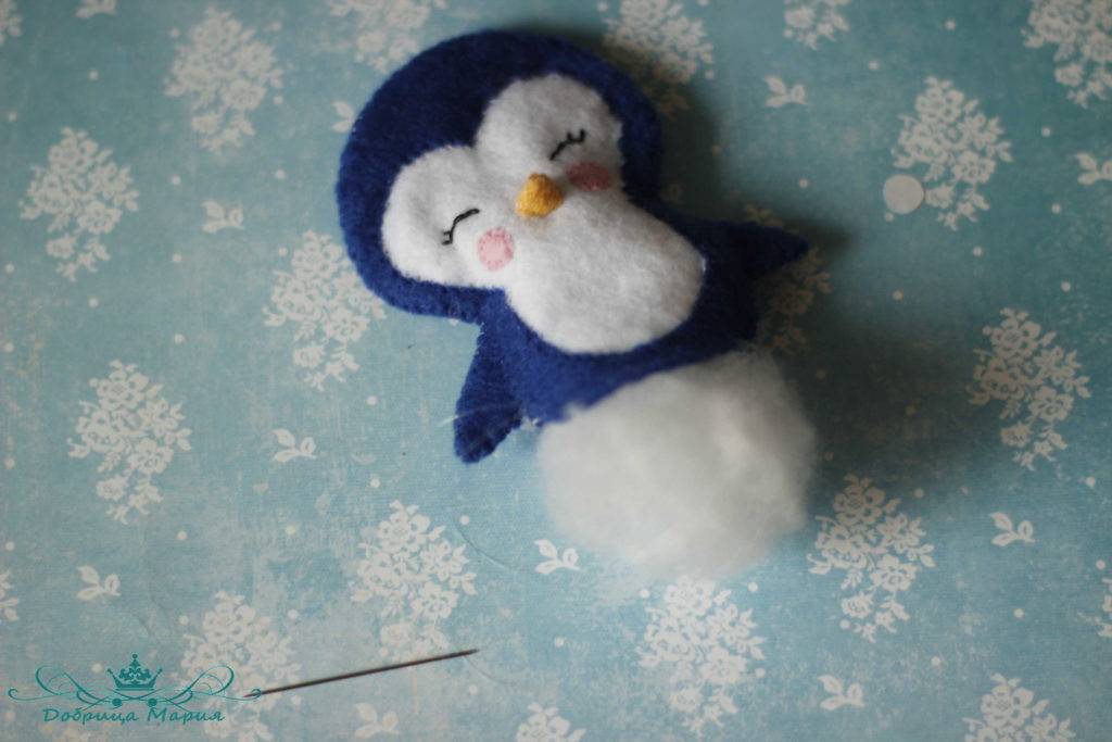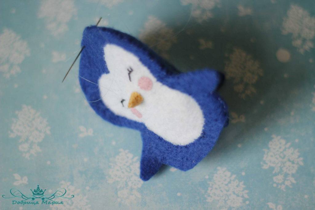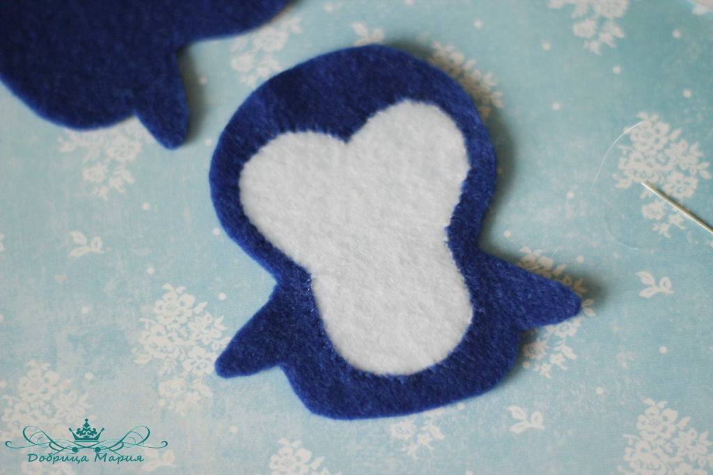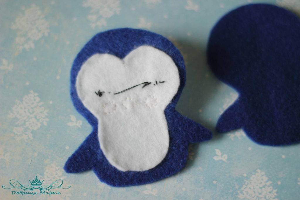 Теперь соедините две части основы и прошейте вокруг всего пингвина, кроме нижней части.
