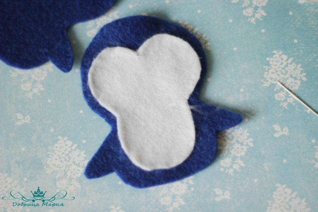 Весь пингвин состоит из двух частей. Приложите центральную деталь к одной части, закрепите ее булавками и обведите контур мылом или мелом.