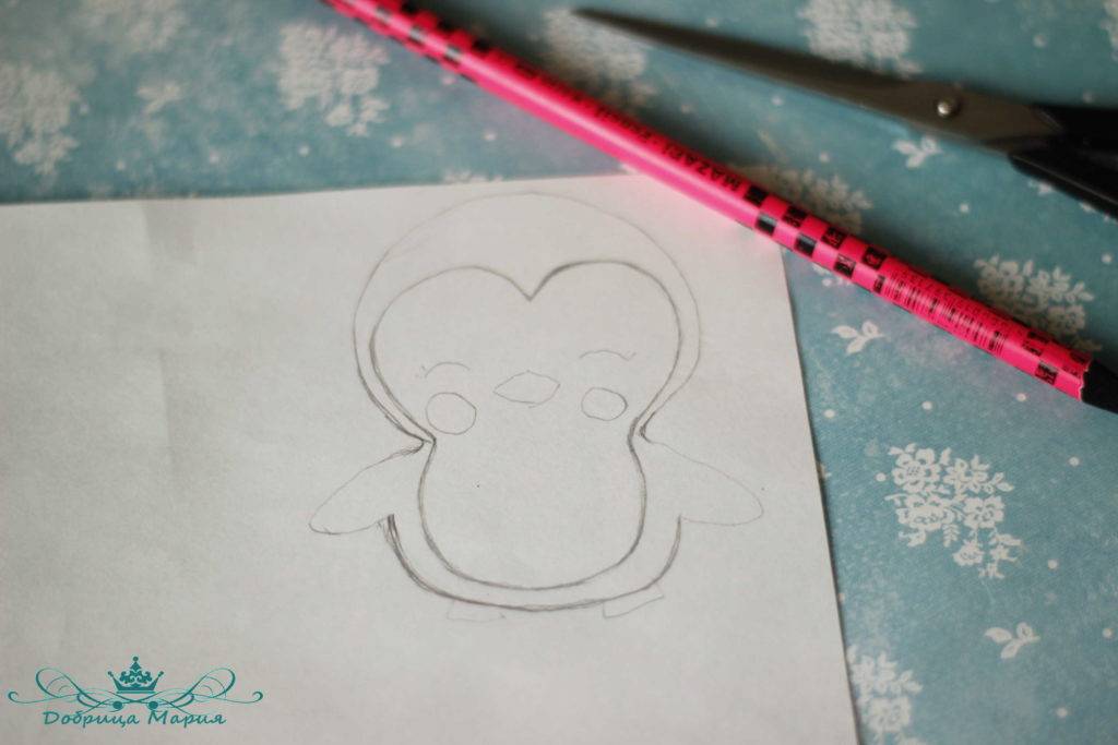 Нарисуйте узор на листе бумаги. Вы можете либо распечатать выкройку, либо приложить лист белой бумаги к экрану компьютера и слегка обвести его карандашом. Шаблон выкройки можно увеличить до нужного размера. В моем случае я немного изменила выкройку, убрав щеки пингвина. Вы также можете самостоятельно изменить готовый шаблон, хотя начинающим рукодельницам лучше начать с использования готового шаблона с выкройкой, чтобы попробовать и понять, как это сделать.