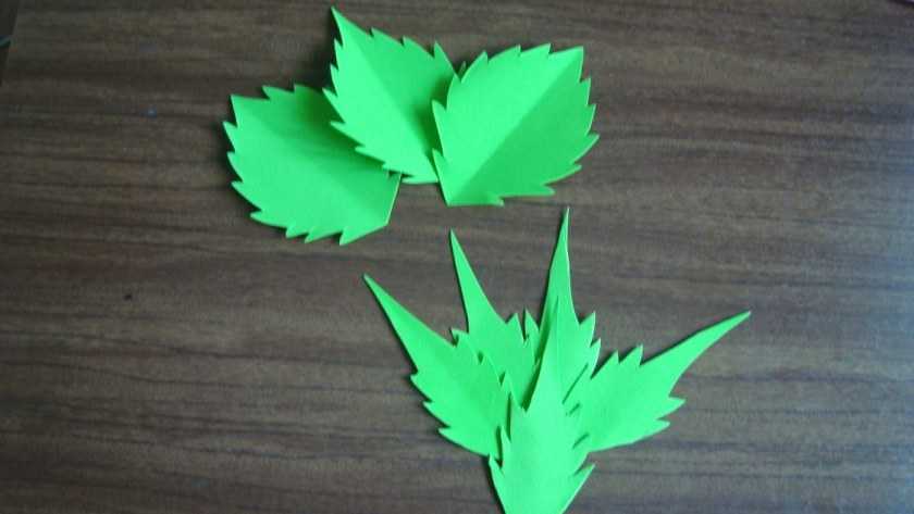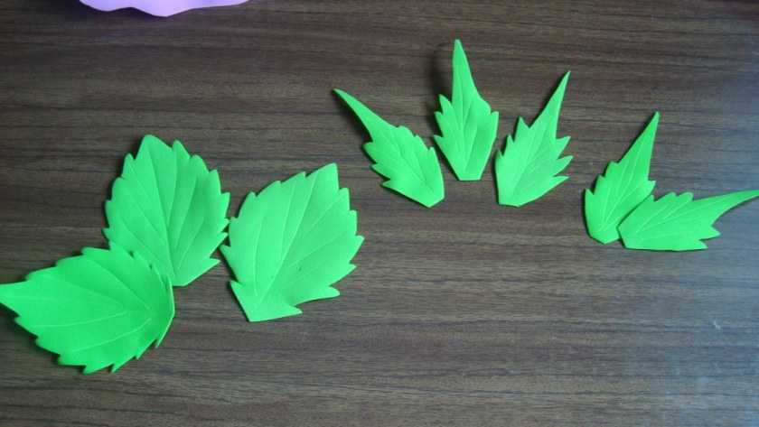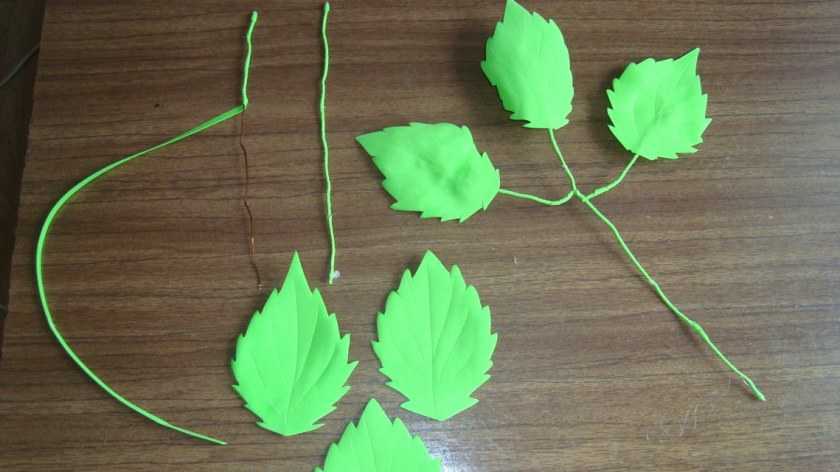 Создайте из картона заготовки для листочков, переведите их на фоамиран и вырежьте, создавая естественные края, как у настоящих листьев. Наденьте их на проволоку, маленькие листочки приклейте к нераскрывшимся бутонам.