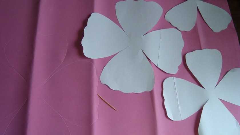 - Подготовив шаблон в виде четырех разных по величине лепестков. После их вырезания контуры переносятся иголкой на фоамиран. Число заготовок от восьми до десяти;