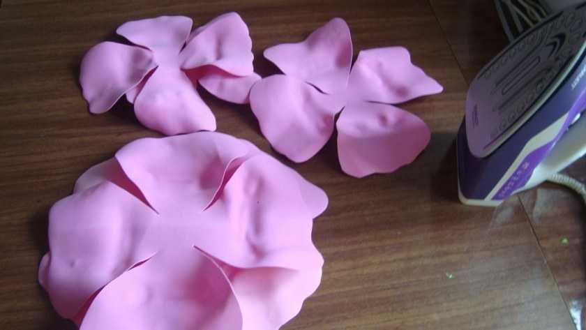 - Нагрейте каждый лепесток, приложив его к утюгу, затем придайте им реалистичную форму, растягивая их по ширине и длине.