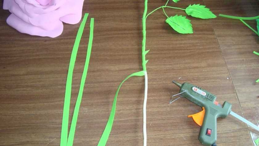- Листки соединяются воедино с закреплением лентой в виде веточек, которые фиксируются на стебле.