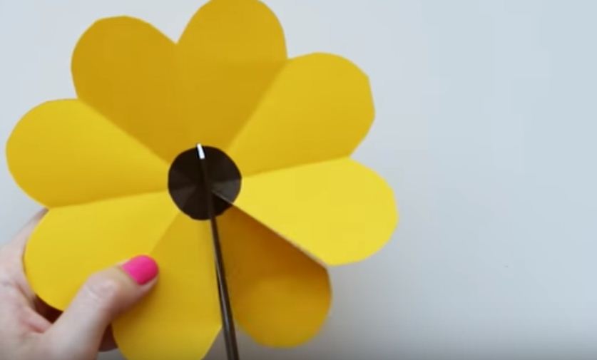 Разворачиваем его в виде цветка. По середине, маркером рисуем небольшой круг и закрашиваем его черным цветом. Затем аккуратно отрезаем один из лепестков.