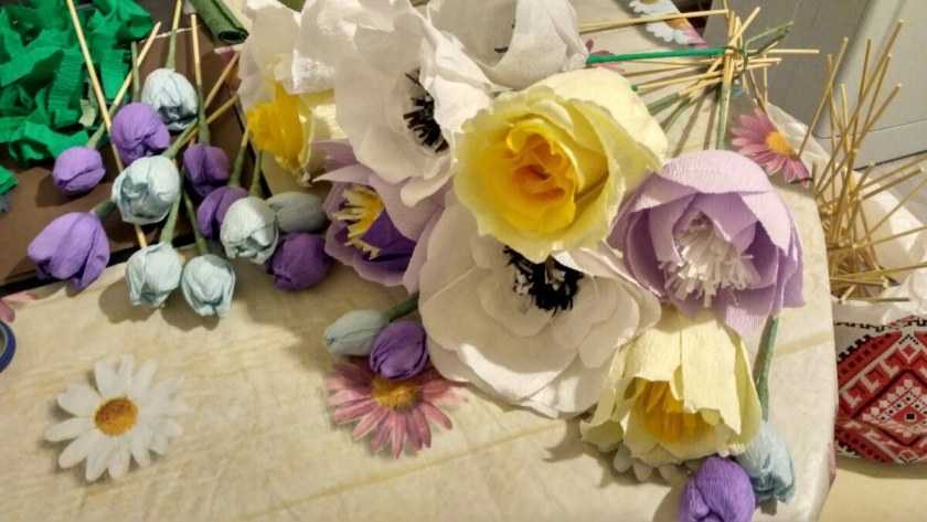 Крепированную бумагу нарезают на небольшие квадраты со стороной примерно 5 см. На создание одного цветка требуются около 10 квадратов. Далее отрезки следует сложить друг на друга крест-накрест и закрепить в центре степлером. Потом каждый квадратик нужно загнуть к центру, создавая объем для цветка. Можно придать цветку более круглую форму, обрезав квадратикам уголки. В такой же последовательности изготавливаются остальные бутоны.