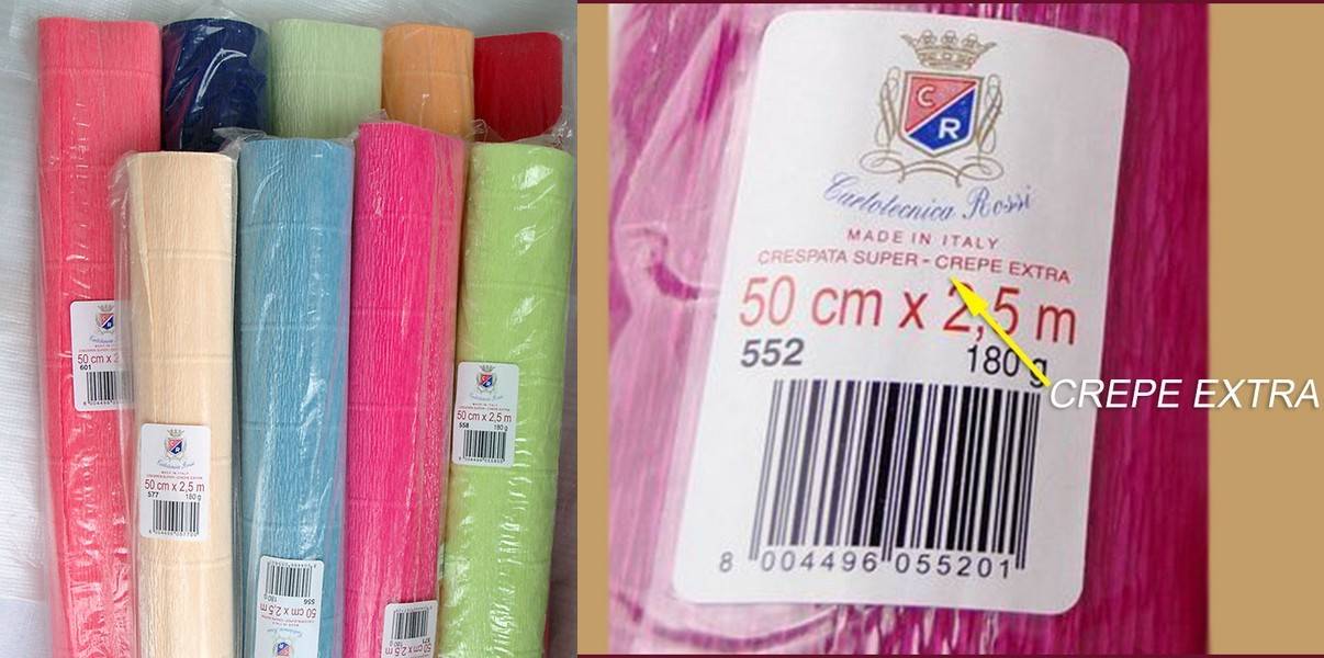 Обратите внимание, что на упаковке бумаги для творчества указано «fine crepe». Маркировка флористической бумаги содержит надпись «crepe extra», а на самих листах есть поперечные фактурные полосы
