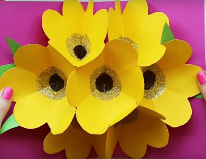 Разворачиваем открытку и у нас получается объемный букетик желтых цветов. Вот такая открыточка с сюрпризом.