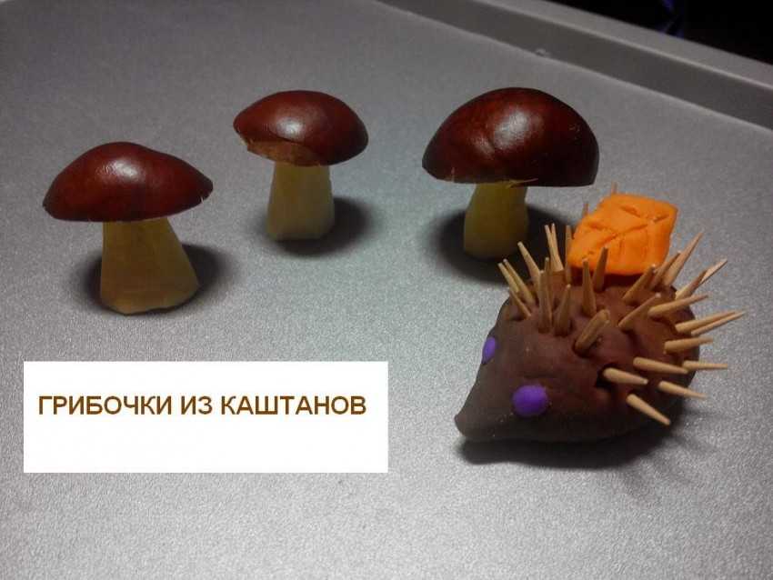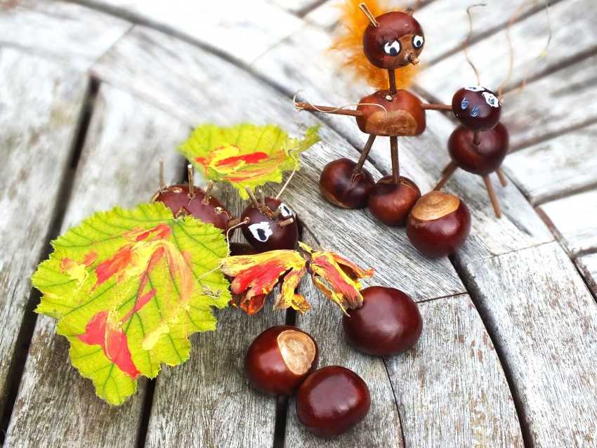 Из каштанов (как и из желудей) можно изготавливать совместно с ребенком различных зверьков, насекомых и человечков. При создании поделок из каштанов можно использовать не только сам плод, но и колючую кожуру. Ниже представлены только некоторые варианты поделок из каштанов.