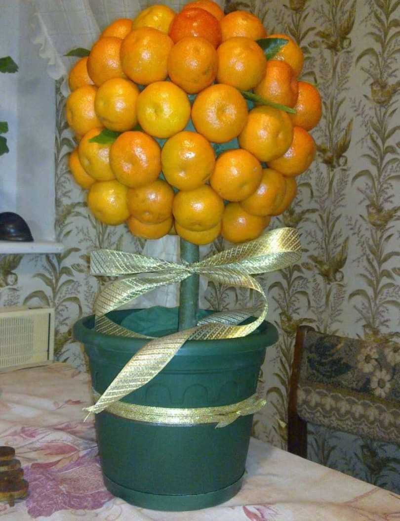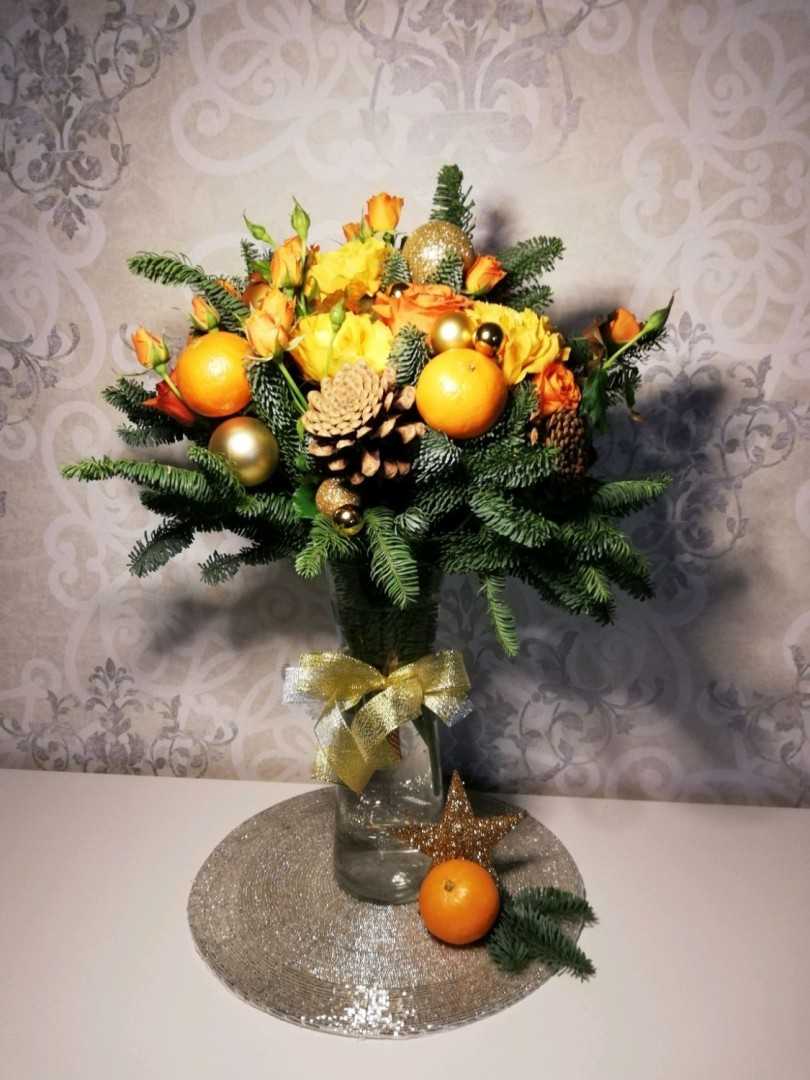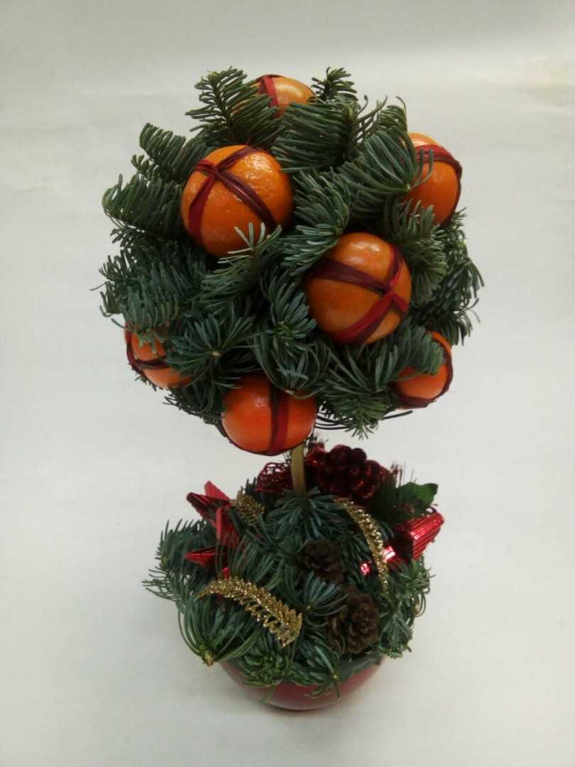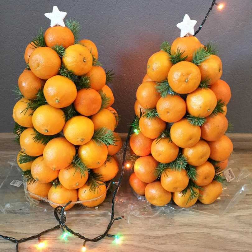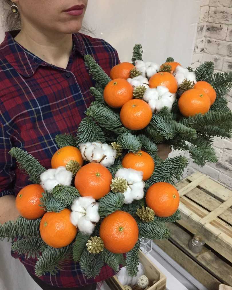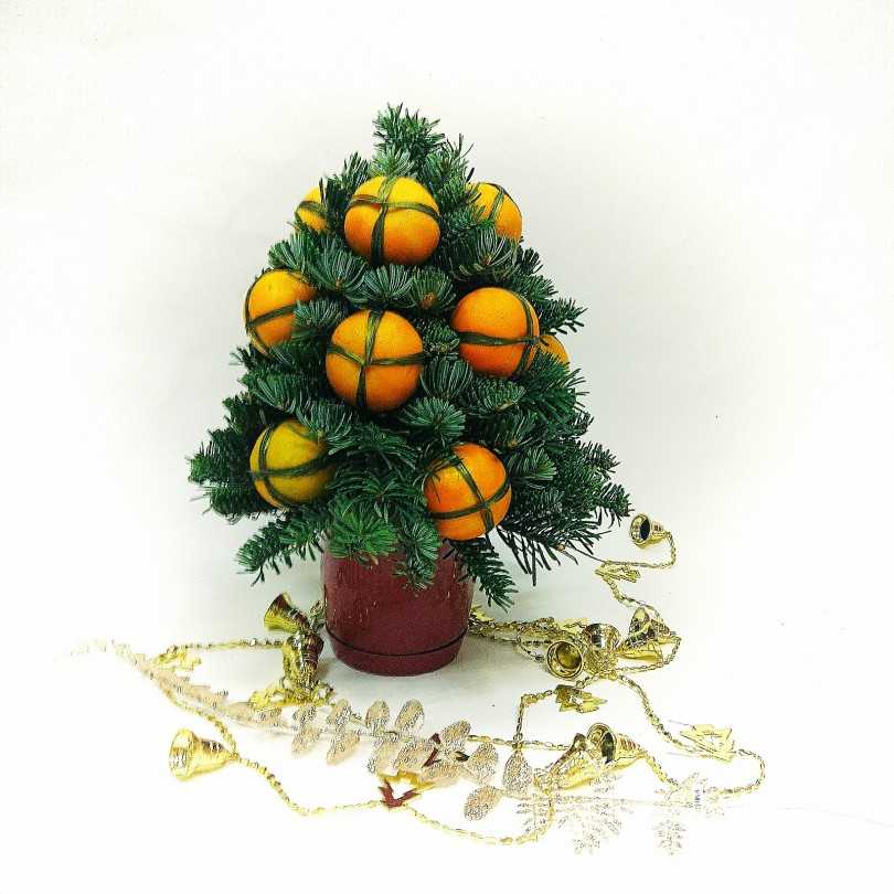 В обычный маленький деревянный ящик красиво уложите хвойные ветки, мандарины, апельсины. В апельсиновую и мандариновую корку вставьте по несколько цветков сухой гвоздики. Такой комплект наполнит помещение не только новогодним, но и полезным для здоровья ароматом.