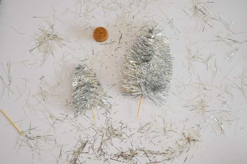 Проверьте, помещается ли ваша елочка в лампочку. Если все отлично, намажьте основание крохотного деревца клеем и с помощью тонкой палочки слегка прижмите ко дну лампы. Аккуратно прокручивая, засыпьте блестки.