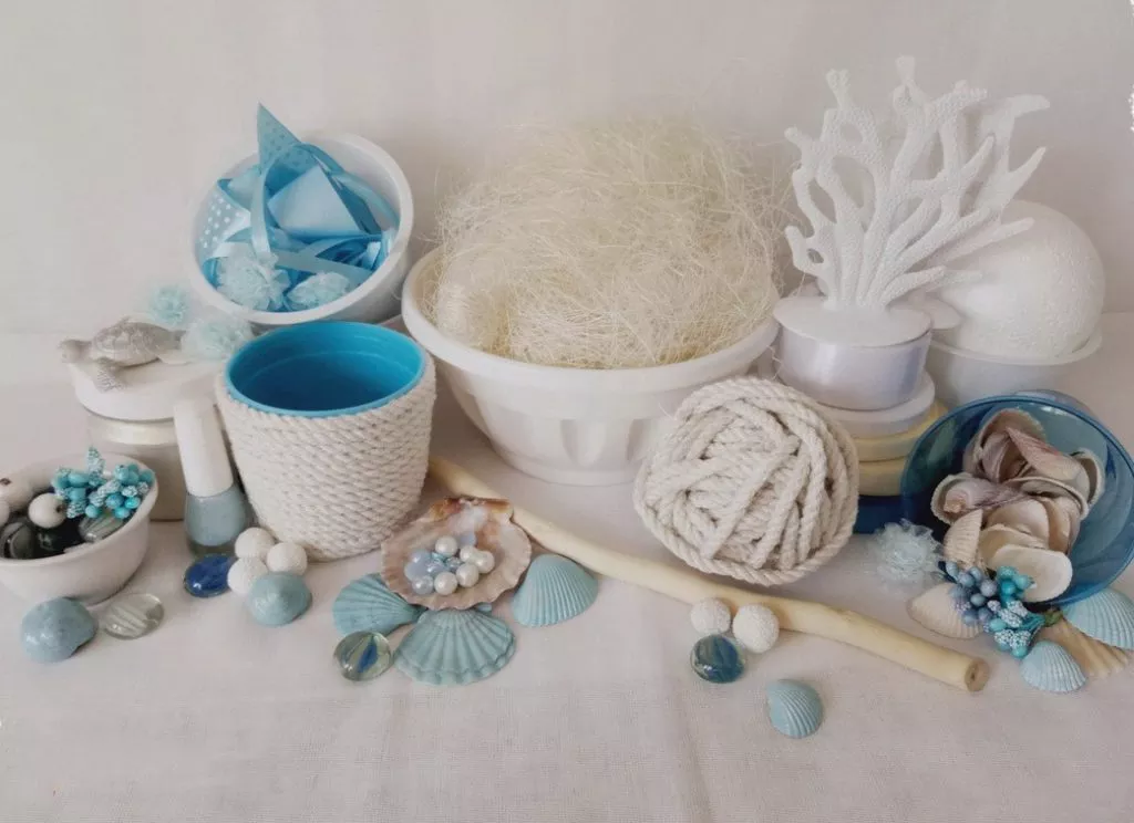 Горшок или чашку, выбранные в качестве основания, можно покрыть белой краской, а поверх нанести синий цвет либо же нарисовать волны. Замаскировать гипс будет проще всего при помощи сизаля синего цвета, зафиксированного на клей. Однако, можно и просто заполнить это пространство небольшими ракушками, галькой и бисером.