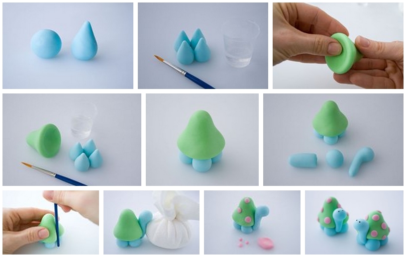 - Слепите голову на вытянутой шее, лапы и хвостик. Прикрепите их к панцирю.