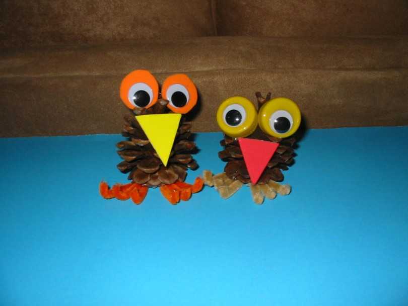 Приклеиваем готовые пластиковые глаза (можно сделать из пластилина или фетра) к широкой части шишки. Приклеиваем и крылья, и нос.