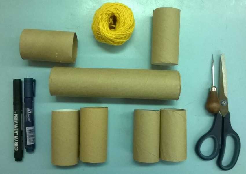 Вам понадобится: 3 втулки, простой карандаш, ножницы, мягкая проволока, верёвка, декоративные глазки, цветная бумага, клеевой пистолет, винная пробка, 2 деревянные палочки, краски, кисточка, кусочек пенопласта.