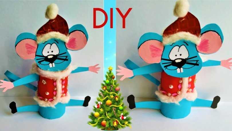 Тубу красим в серый цвет или обклеиваем бумагой. Из серого картона вырежем и вставим в прорези круглые ушки. Длинный хвост и лапки станут дополнением. Добавляем розовые акценты на уши, животик, носик. Глаза можно выполнить в технике аппликации, есть вариант купить готовые в магазине рукоделия.