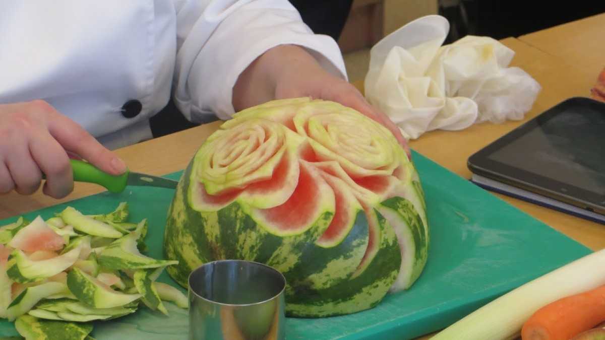 - Маленькие цветочки также вырезаем из дыни. Не стоит спешить, чтобы ничего не испортить и быть довольным полученным результатом.