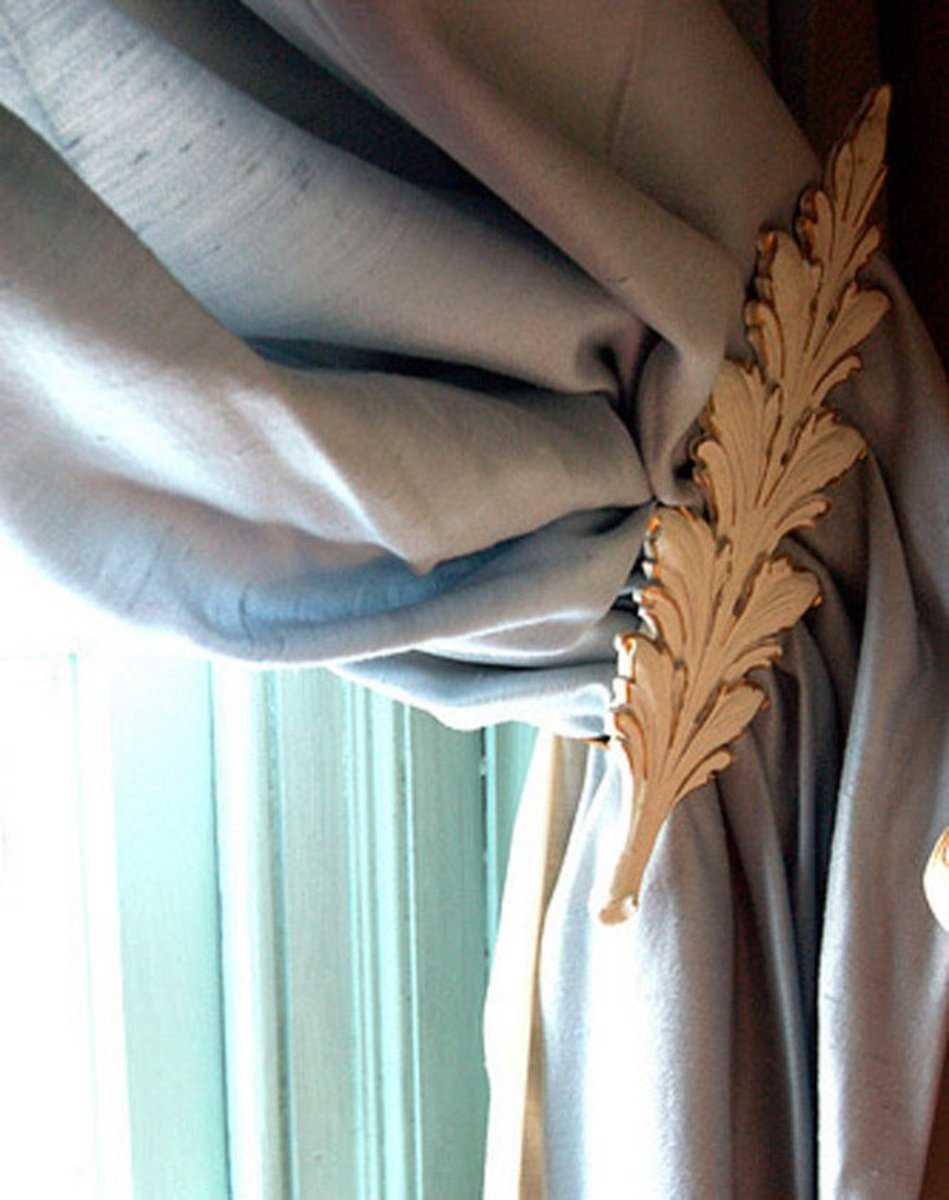 По материалу исполнения подхваты бывают текстильными, деревянными, металлическими, кожаными или пластиковыми. При творческом подходе держателем ткани становится любой элемент: заколки, игрушки, искусственные цветы и бабочки, нашитые на тесьму.