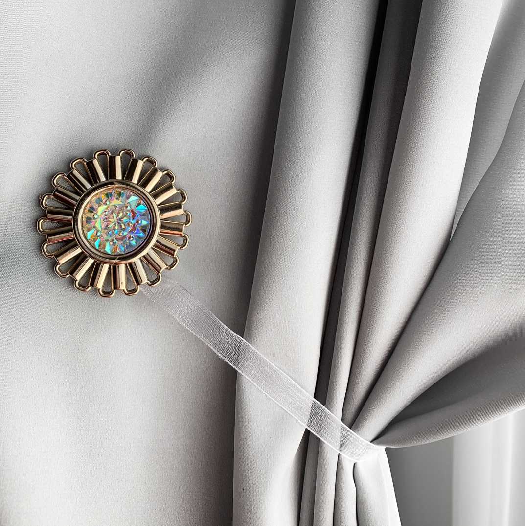 Подхваты для штор на магнитах будут неплохо смотреться на легкой, струящейся материи. Для работы понадобятся несколько магнитов (их количество зависит от веса гардин), тканевая полоска или ленточка из атласа для соединения, декор для украшения.