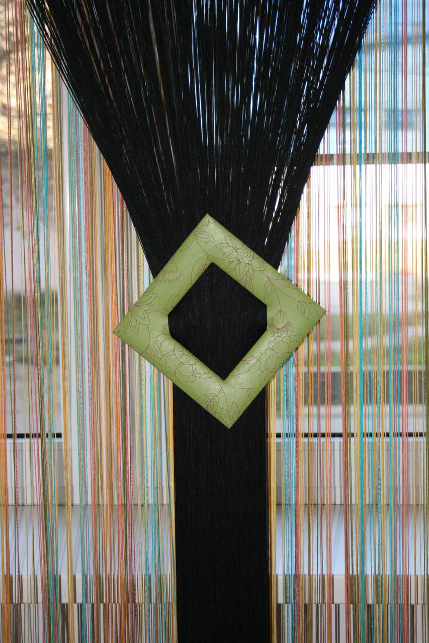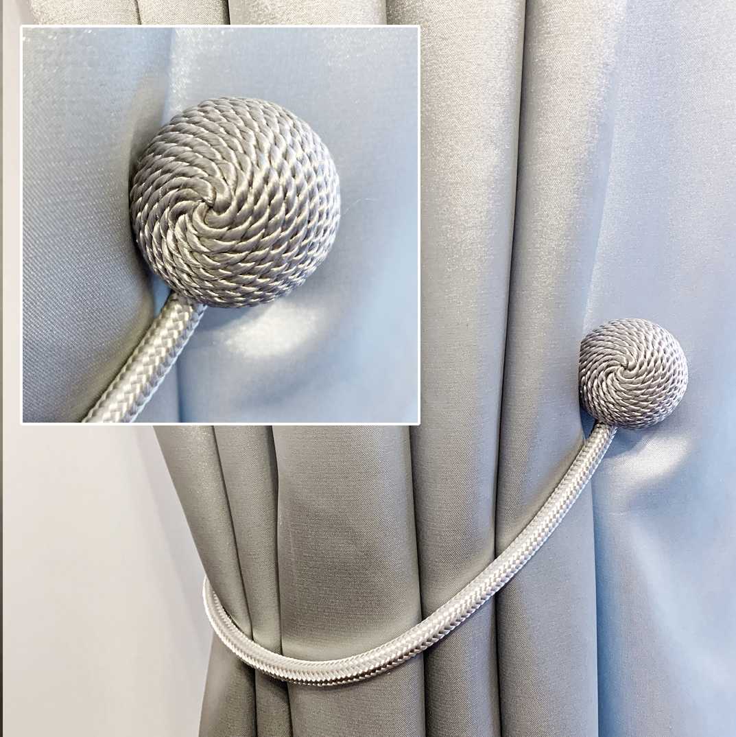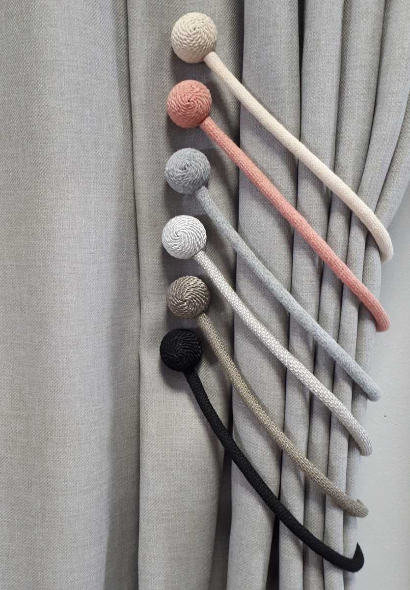 - Для лёгких штор из тюля, тонкого хлопка или полиэстера, нитяных занавесей подойдут магнитные подхваты, заколки, цепочки, ленты и верёвки.