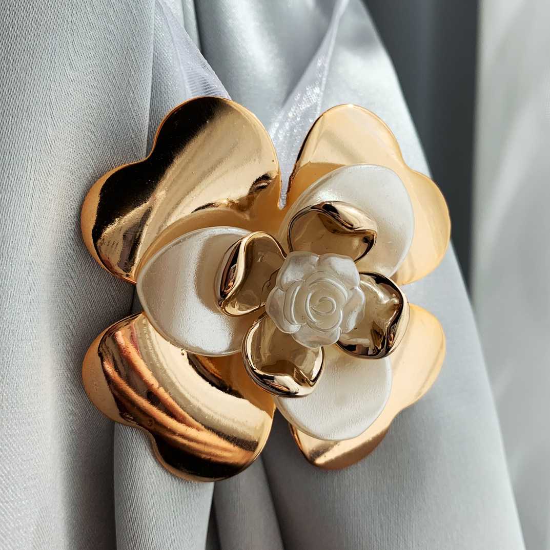 - Тяжёлые портьеры классического стиля прихватывают аксессуарами из благородных тканей или плетёные шнуры с роскошными кистями. Также используют твёрдые зажимы под латунь и бронзу с дизайном «под старину».