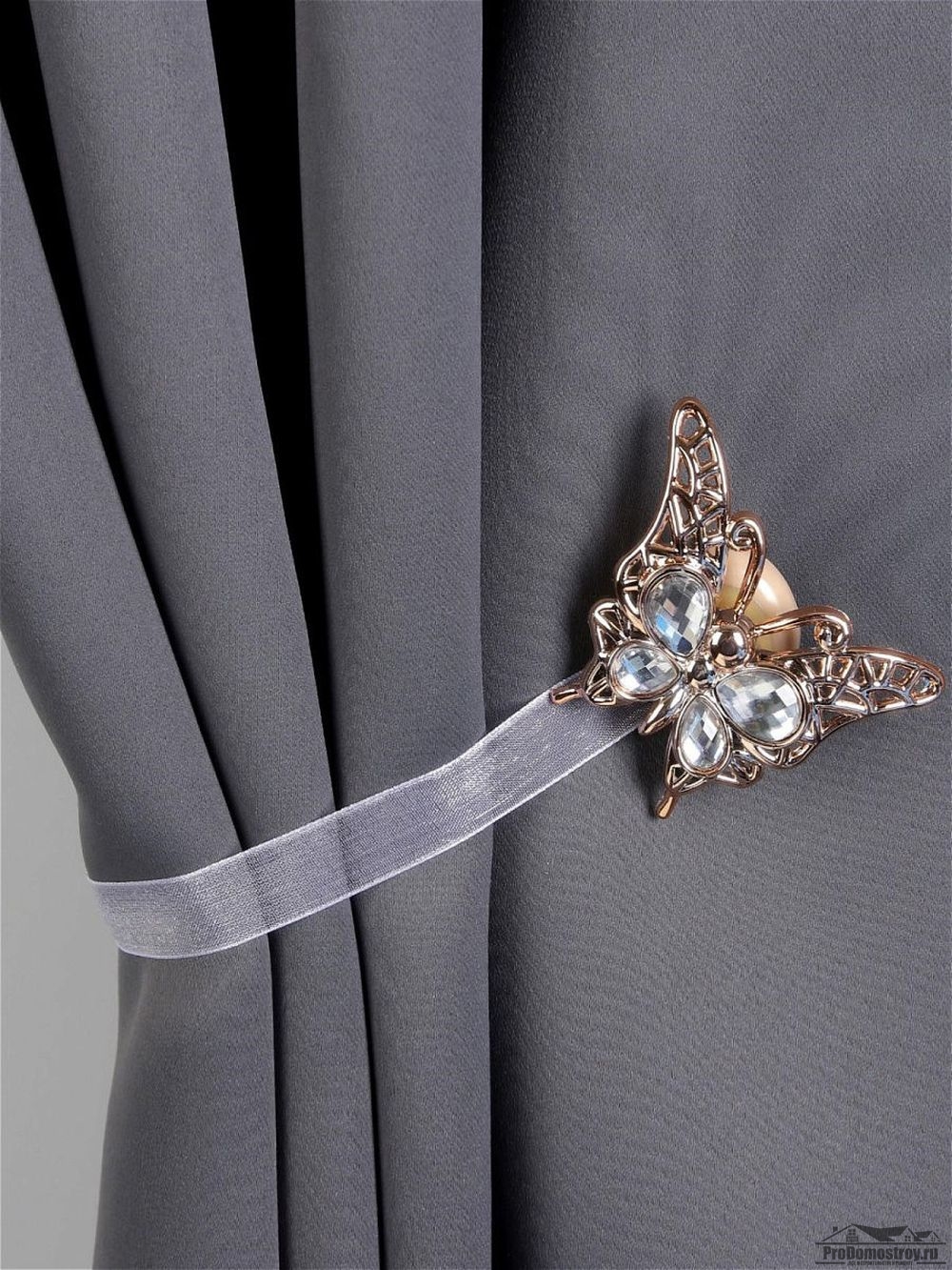 Заколки для ткани из металла, пластика или дерева отличаются от аналогичных аксессуаров для волос только размерами. Они должны соответствовать ткани по плотности. Легким тюлевым гардинам лучше подойдут небольшие изящные заколки, занавескам из плотных тканей придется подобрать крупные изделия. Для тяжелых портьер заколки не подойдут, здесь уместнее металлические держатели или тканевые подхваты «бананы».
