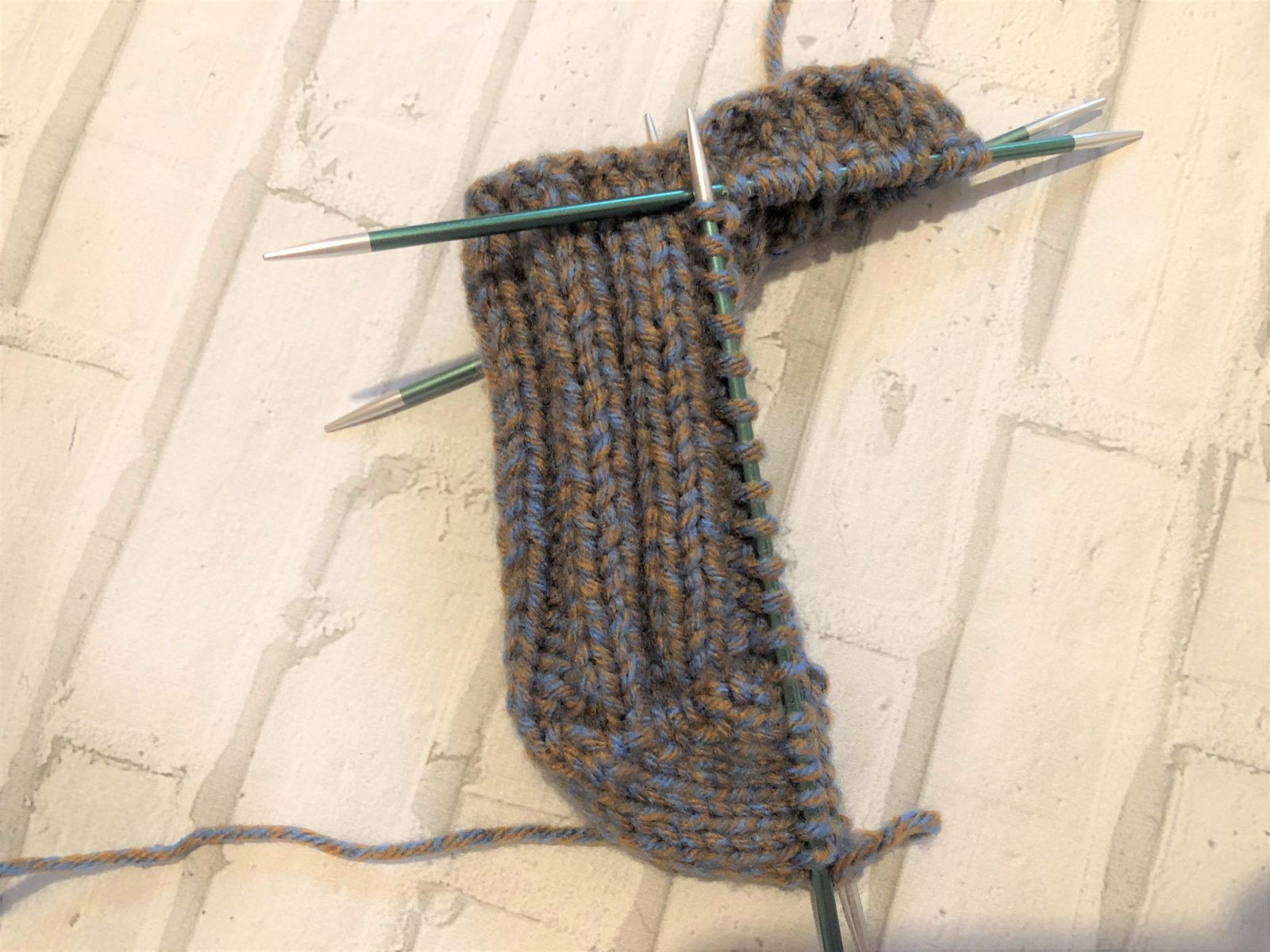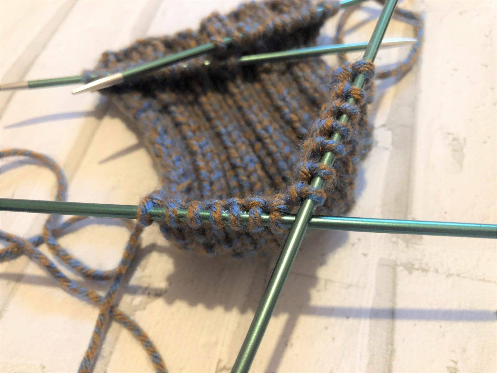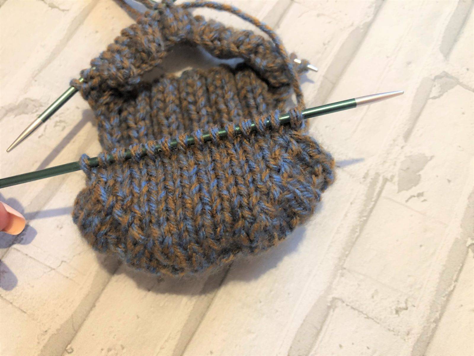 - Вяжем платочной вязкой до убавления на носочке.
