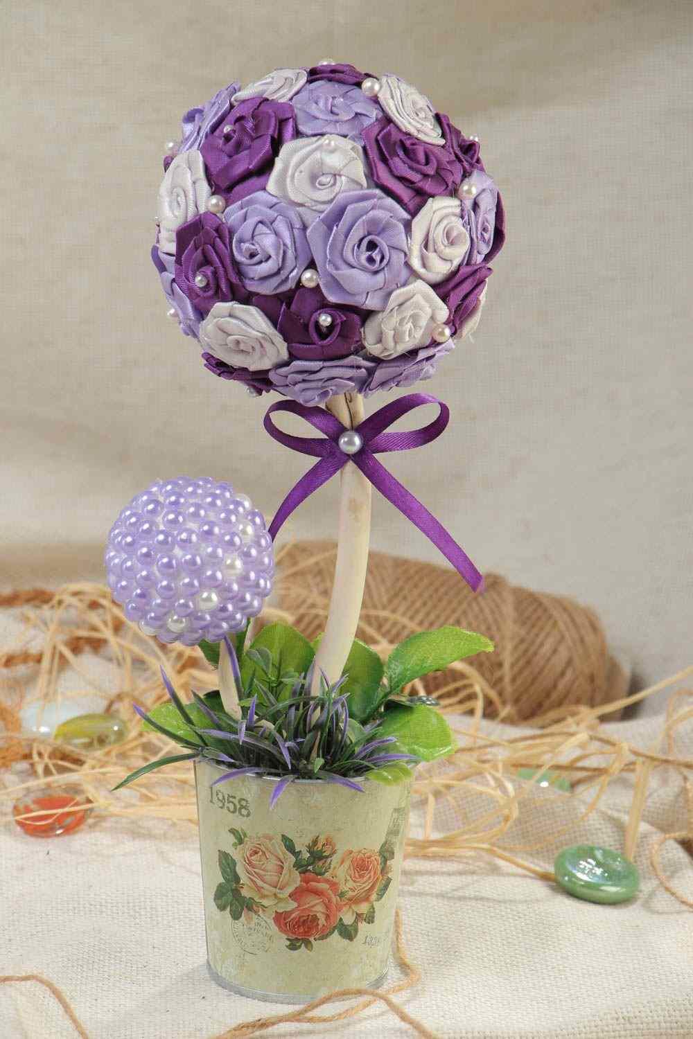 Топиарий из атласных лент станет отличным подарком близким людям и родственникам. Он выглядит нежно и роскошно, отлично впишется практически в каждый интерьер.