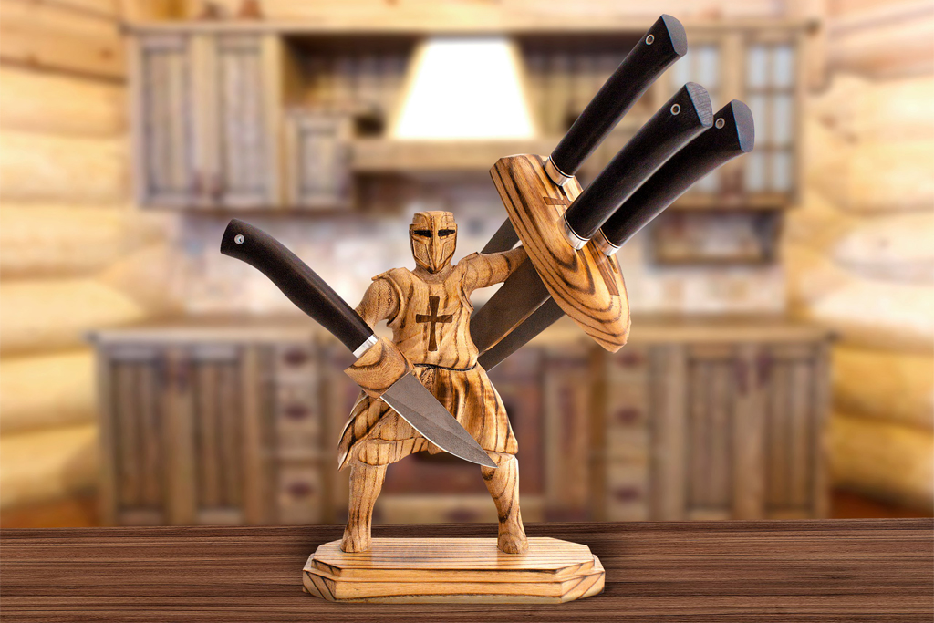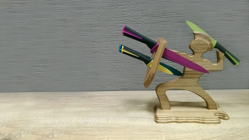 Интересный вариант – изготовить держатель для кухонных ножей в форме человека со щитом и копьём. Такая подставка станет прекрасным дополнением любой кухни. Этот способ подойдёт только тем, кто умеет вырезать фигуры из фанеры при помощи лобзика.