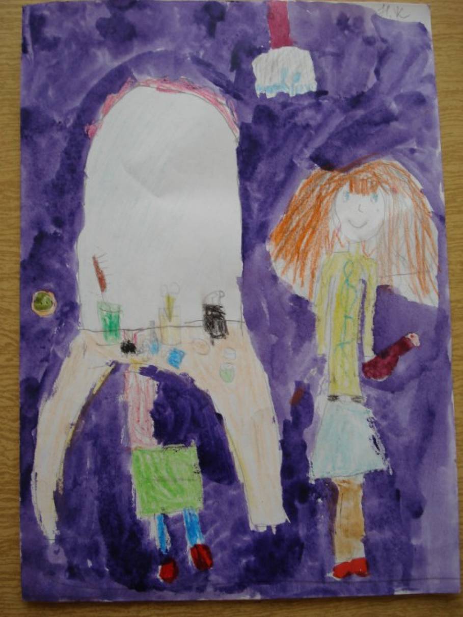Завершающим этапом будет петух в руке у нашего повара. Художник изобразил его очень правдоподобно. Но если вам повторить это сложно, тогда дайте в руку вашему мультяшному кулинару большую ложку или нож. Получится тоже здорово!