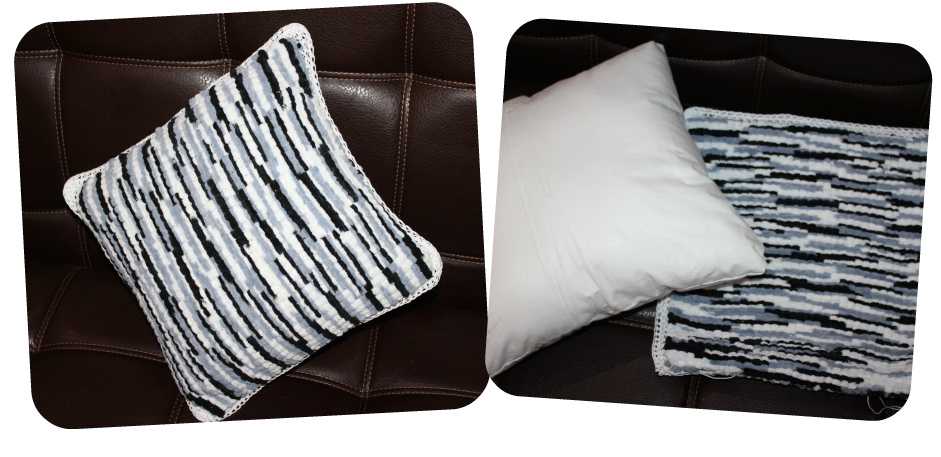 Далее, при помощи крючка и любой, выбранной Вами пряжи, обвяжите все четыре стороны деталей, чтобы их проще было соединять между собой. Сшейте иглой, или свяжите при помощи крючка три стороны, поместите в подушку и соедините четвертую сторону. Также в наволочку можно вшить молнию, кнопки или пуговицы.
