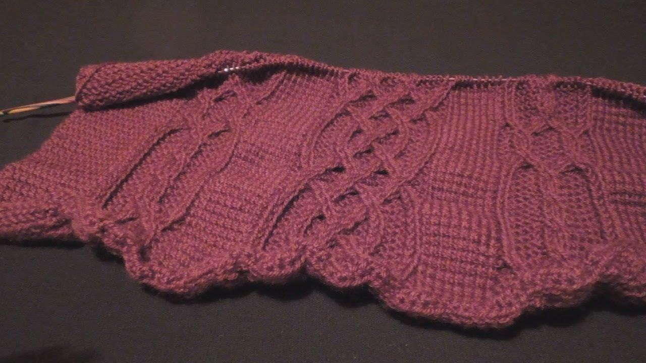 Незаконченные (сокращенные) столбцы с накидами вяжутся, как и обычные, только в финале две последние петли не закрываются и оставляются на крючке.