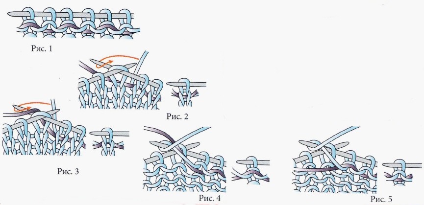 На лицевой стороне вязать правой спицей и держать нить второго цвета в левой руке. Ввести правую спицу в петлю и пропустить нить один раз под рабочей нитью, второй раз над рабочей нитью (рис. 2, 3). Петли провязывать только рабочей нитью. При этом перемычки подхватывают рабочей нитью на каждой второй петле, или через несколько петель.