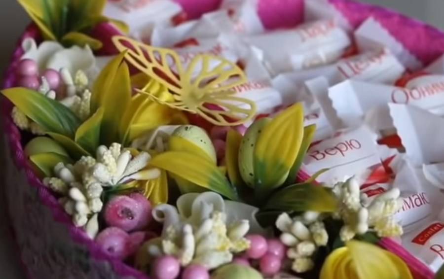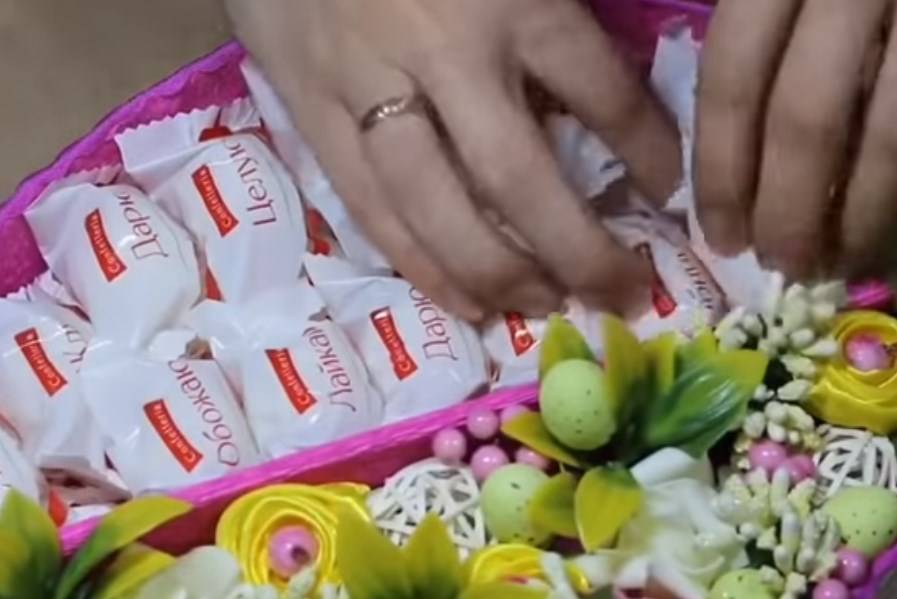 Полоски немного расправляем, кладем на дно коробочки, а сверху – любые конфеты, главное, чтобы их обертка подходила по цвету всей композиции.