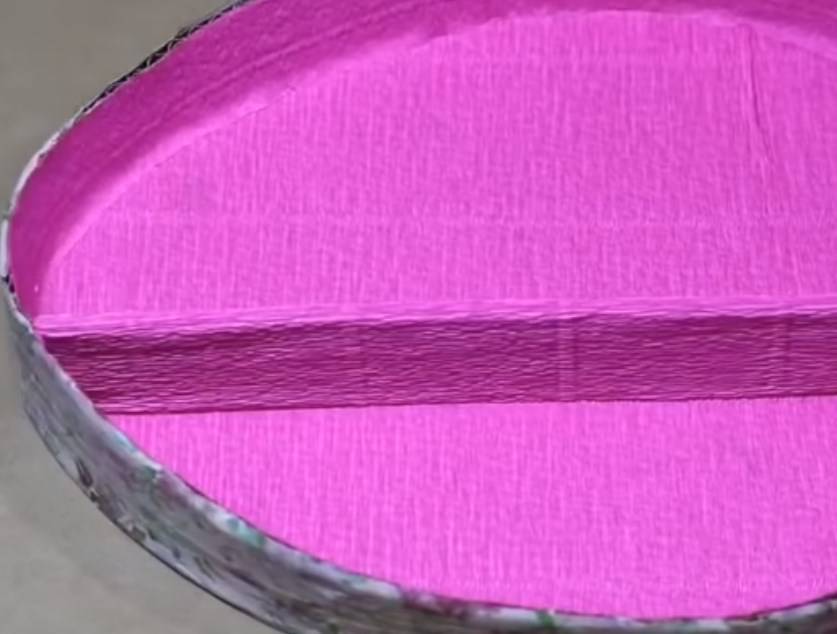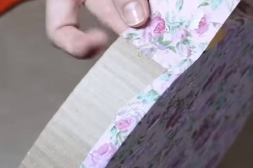 - Получившуюся коробочку переворачиваем, и дно обклеиваем гофрированной бумагой или тканью на самоклеящейся основе.