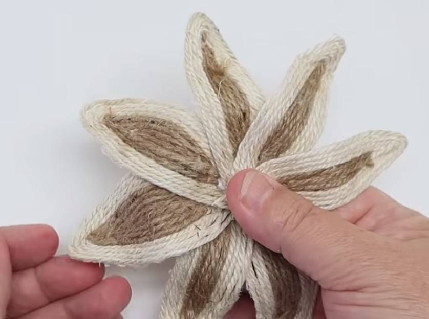 - Ряд за рядом наносим клей, затем джут светлый, а после темный. И пока клей еще до конца не высох, придаем лепестку нужную форму. И по такой технологии делаем по пять лепестков всех указанных размеров.
