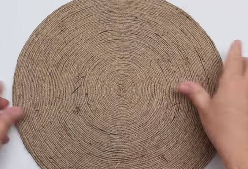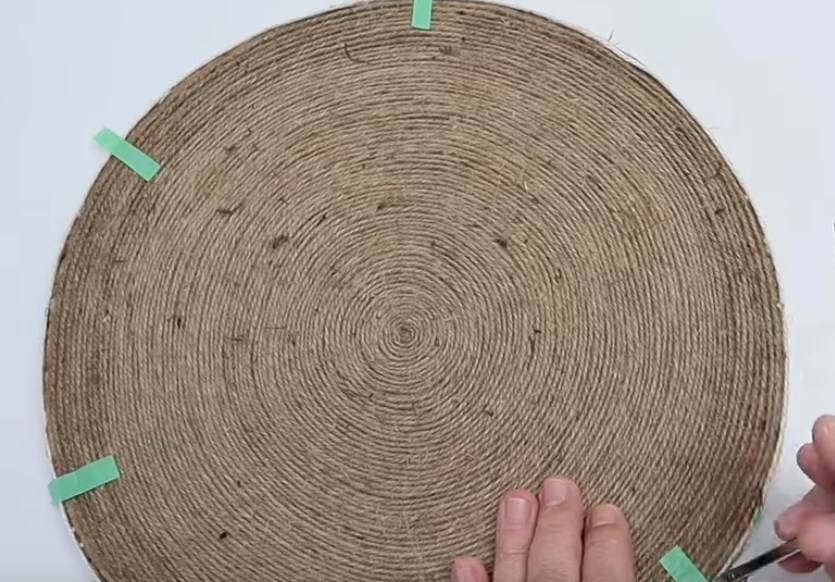 Из картонной коробки вырезаем круг диаметром 32 см. При помощи клея обматываем его джутом. После сверху на него кладем какой-нибудь груз и оставляем на 2-3 часа.