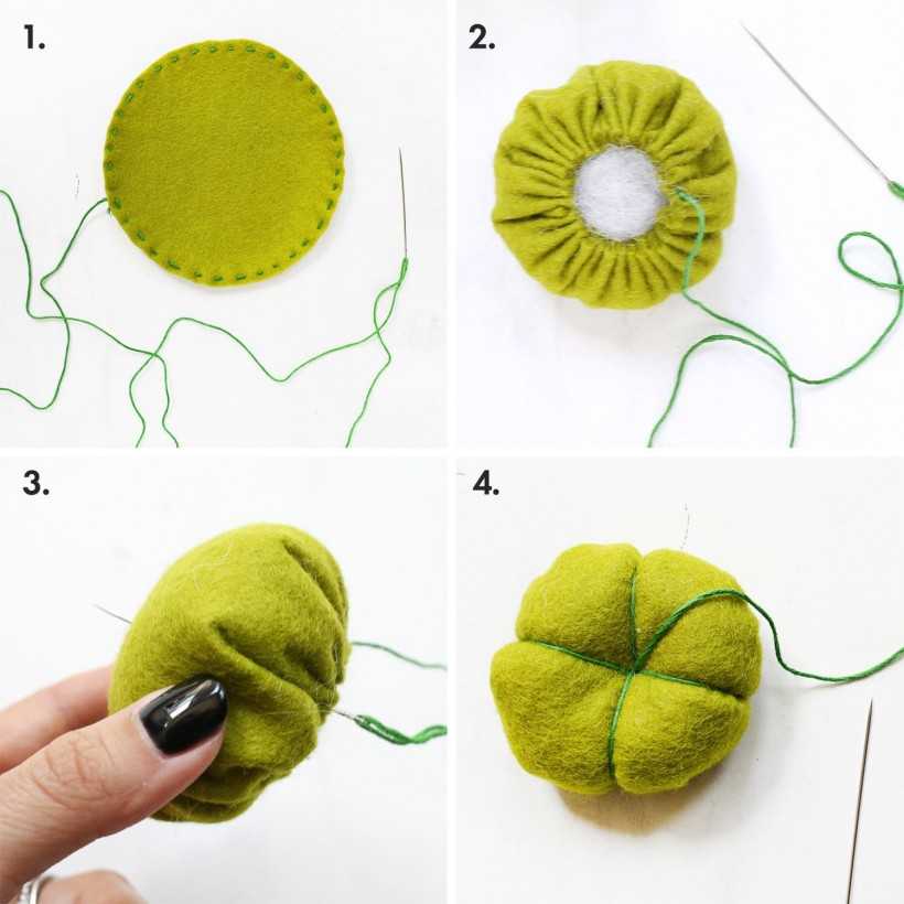 - Стянуть края и закрепить нитку. У вас получится округлый «колобок».